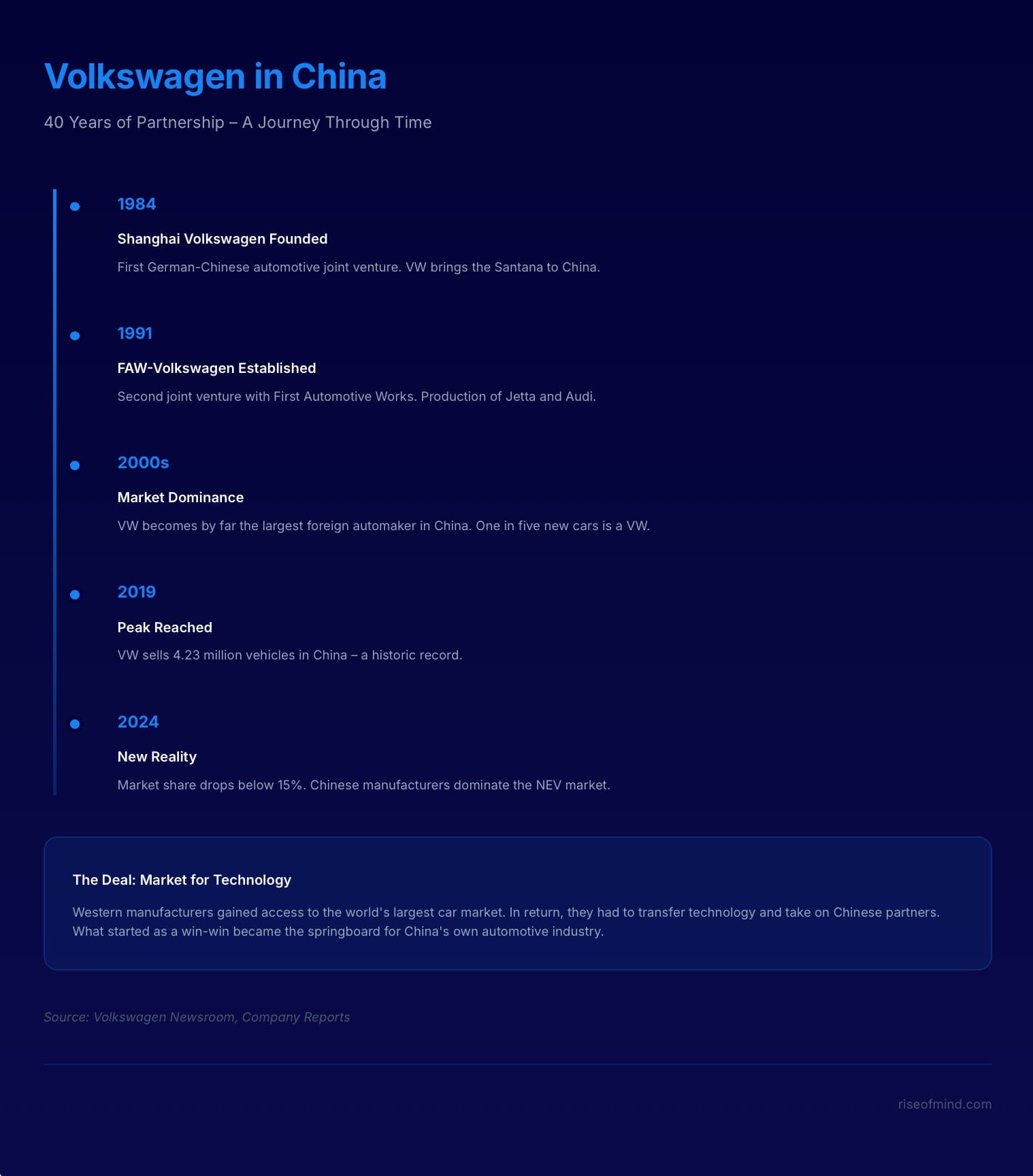 The deal was clearly defined from the outset: market access in exchange for technology transfer. A 50:50 partnership, entered into with full knowledge of the facts. And the model worked – VW was number one in China for almost 40 years. At times, VW's market share exceeded 40 per cent.