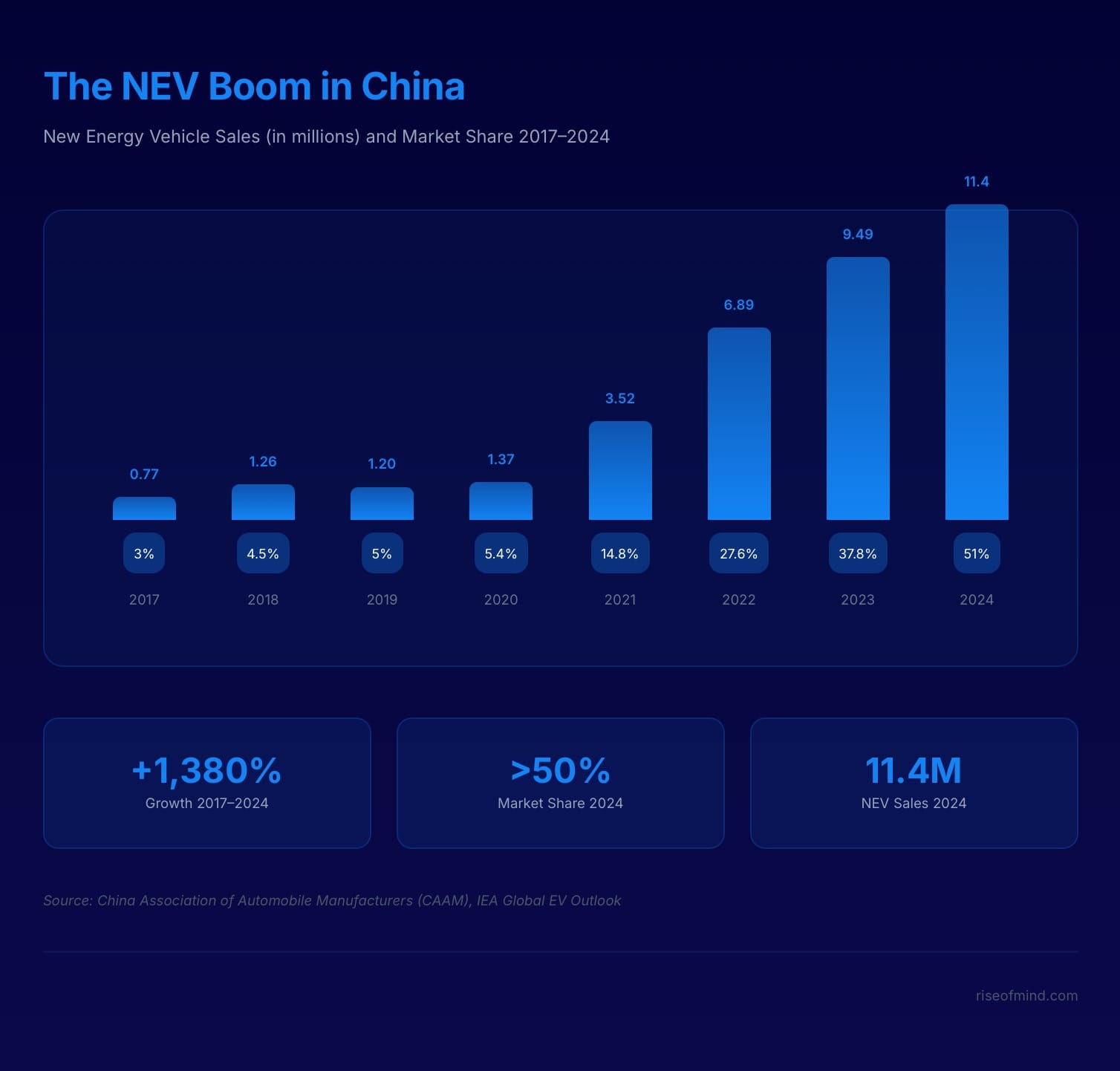 The figures speak for themselves: between 2017 and 2024, NEV sales in China rose from less than one million to over 11 million vehicles. Market penetration grew in parallel from around 3 per cent to more than 50 per cent.