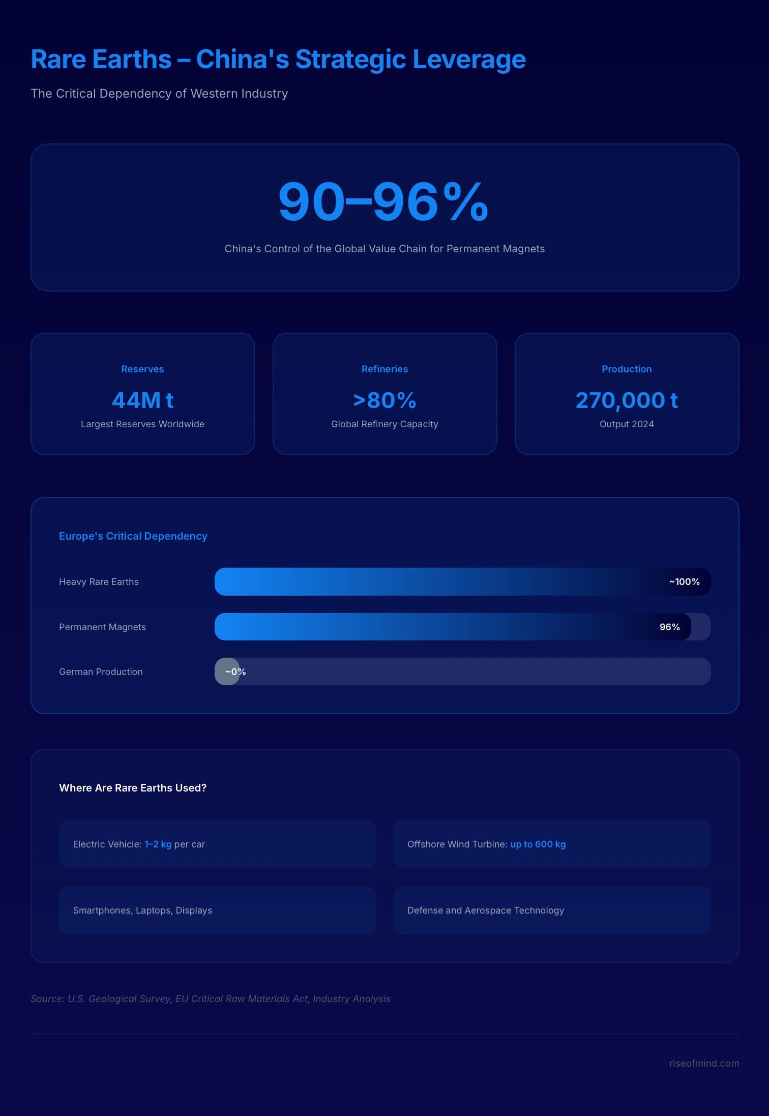 An average electric vehicle requires 1 to 2 kilograms of rare earth magnets. A single offshore wind turbine requires up to 600 kilograms. The entire green and digital transformation of the West is based on raw materials, the key to which lies almost exclusively in Beijing.