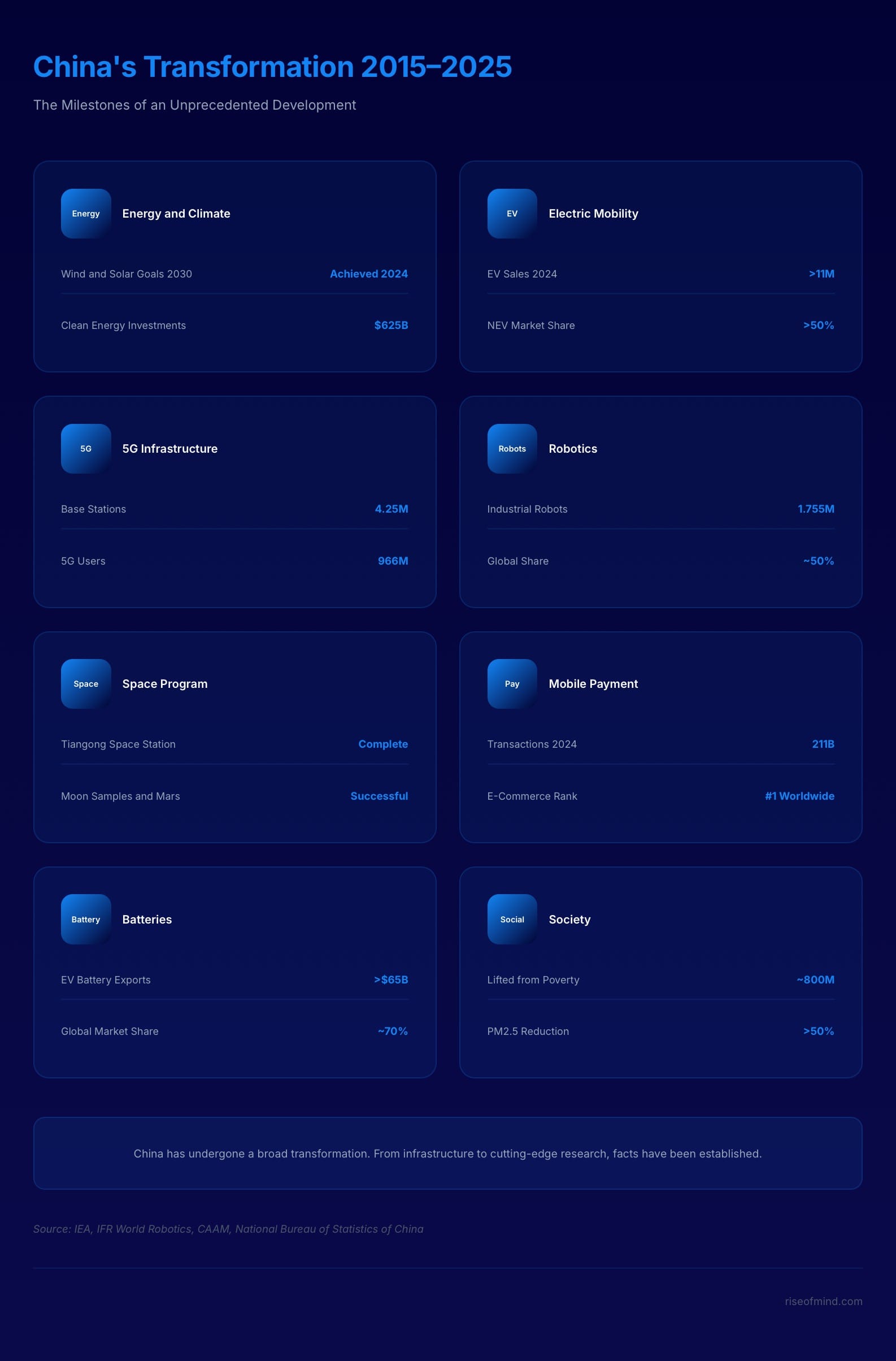 China's transformation between 2015 and 2025 encompasses almost all strategic sectors. Here is a selection of the documented successes: