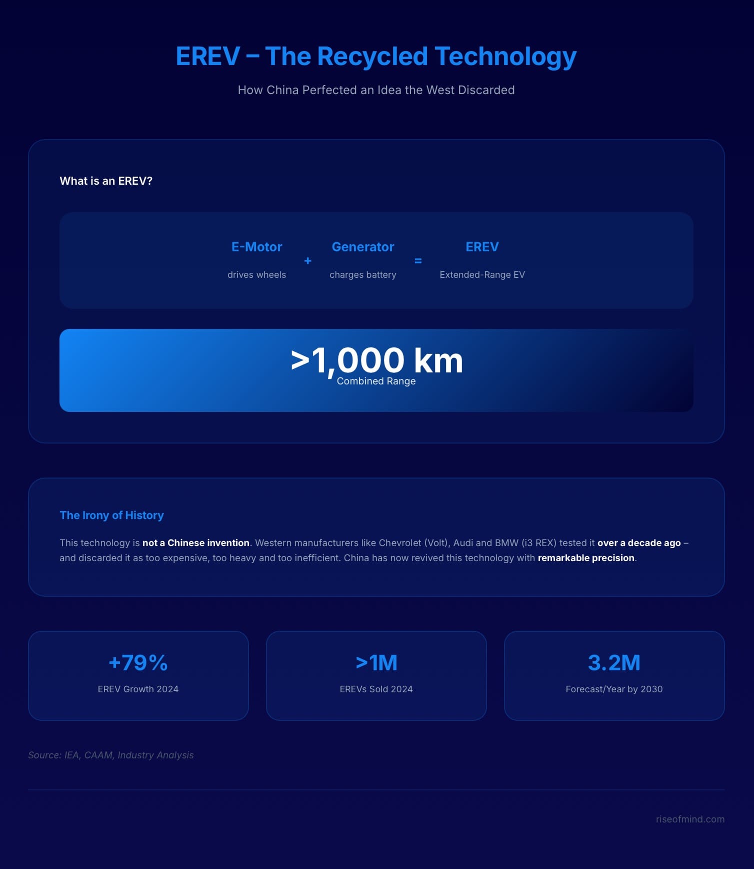 The EREV can be thought of as a safety net for a high-wire artist: while Europe demands that drivers walk the tightrope immediately without a net – i.e. with purely electric cars – China offers them an invisible net in the form of a petrol generator. This alleviates the fear of falling – the range anxiety – and ensures that many more people dare to walk the tightrope in the first place.