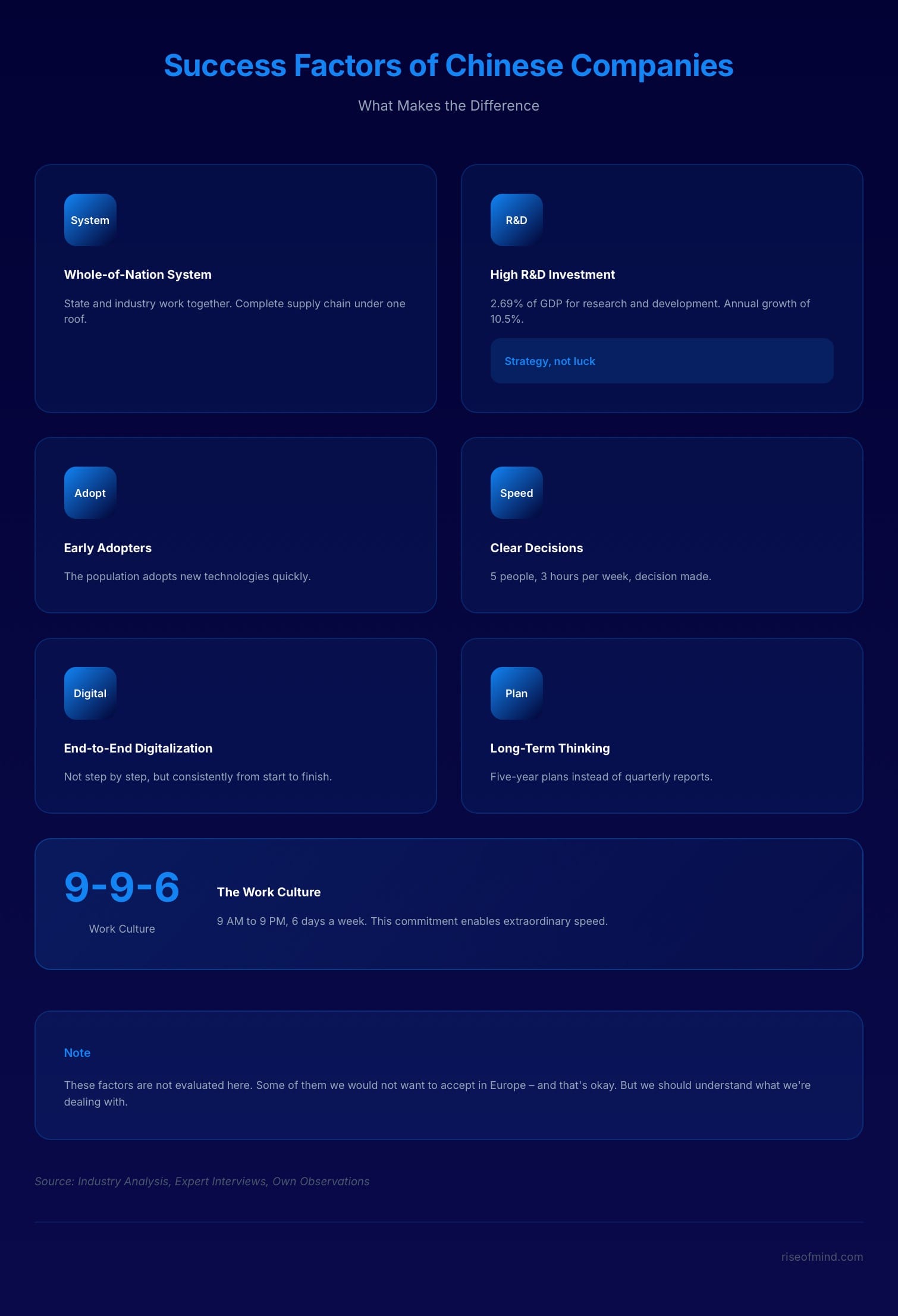 The 9-9-6 work culture: Working from 9 a.m. to 9 p.m., six days a week – that's almost twice as many working hours as in the West. This enormous commitment enables extraordinary speed and steep learning curves. However, I hear that this model is increasingly being viewed critically, especially by younger Chinese people, and that issues such as work-life balance are gaining in importance. Nevertheless, the difference to the Western working world remains considerable.