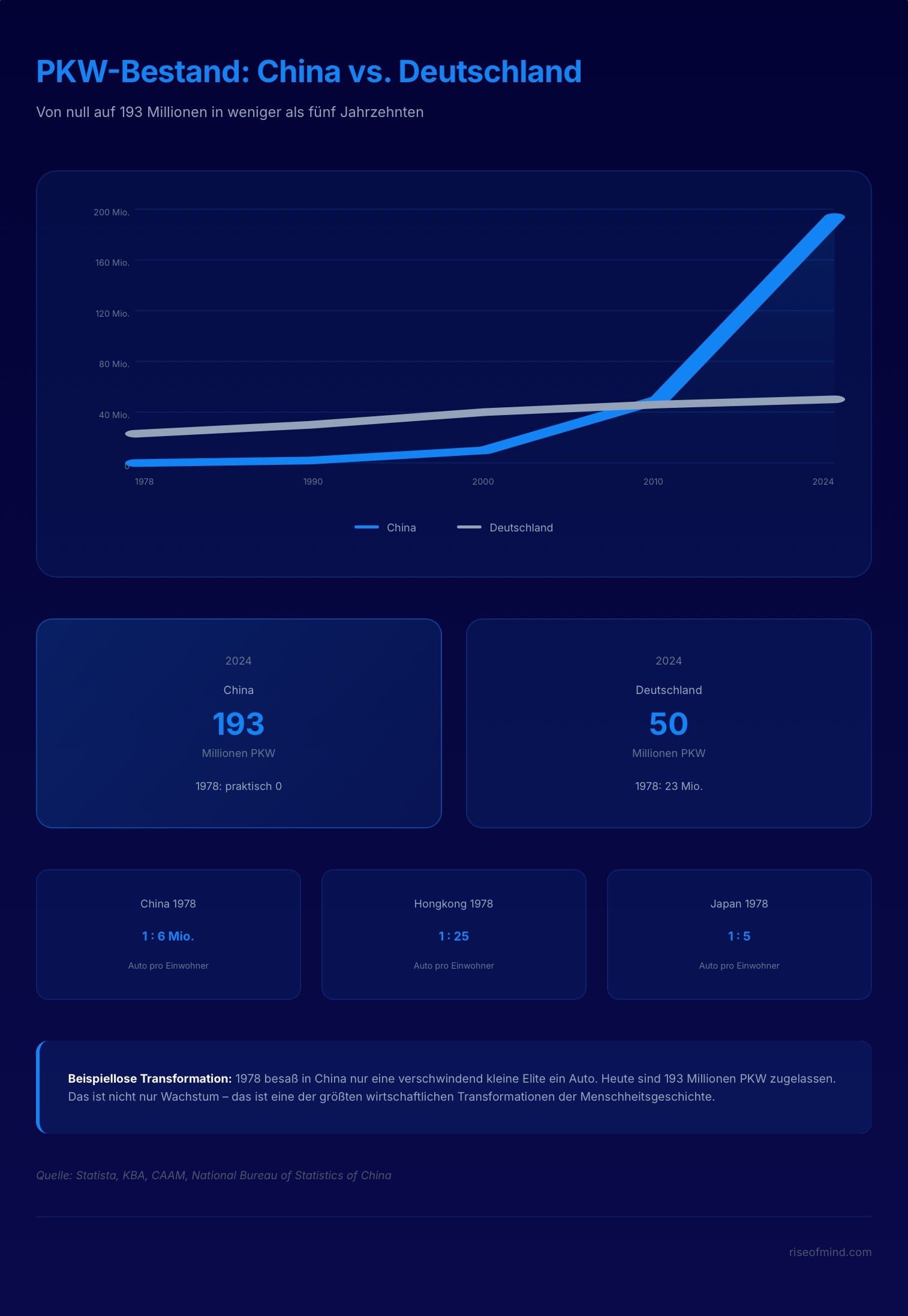 Heute sind in China rund 193 Millionen PKW zugelassen. Von null auf fast 200 Millionen in weniger als fünf Jahrzehnten. Das ist nicht nur Wachstum – das ist eine beispiellose Transformation.