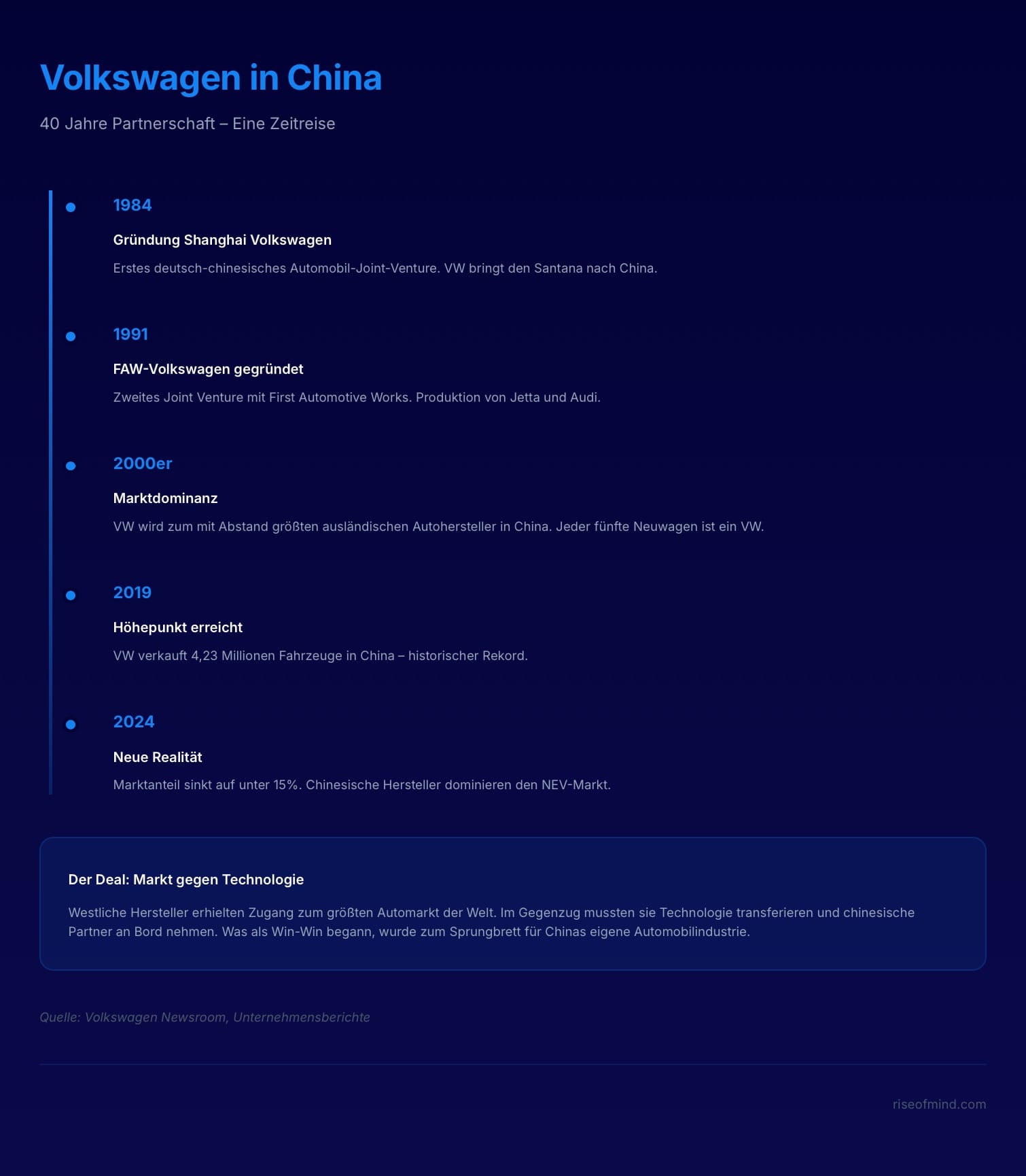 Der Deal war von Anfang an klar definiert: Marktzugang gegen Technologietransfer. Eine 50:50-Partnerschaft, eingegangen sehenden Auges. Und das Modell funktionierte – fast 40 Jahre lang war VW die Nummer eins in China. Der Marktanteil von VW lag zeitweise bei über 40 Prozent.