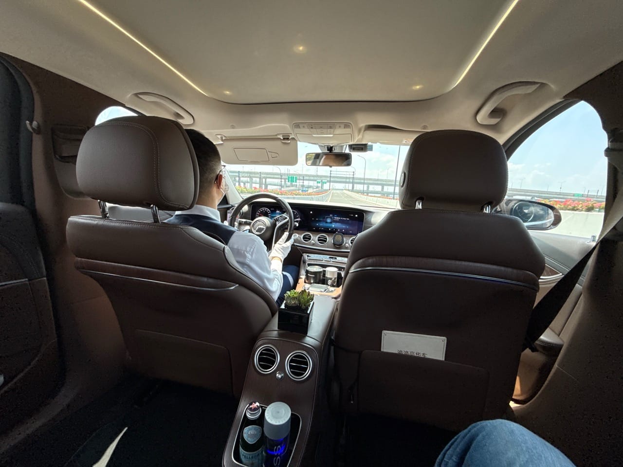 Wenn man sich ein Fahrzeug der Luxe-Kategorie bestellt, ist das schlicht ein Erlebnis, wie man es in der westlichen Welt nicht findet. In der Regel kommt auf die Minute genau eine schwarze Limousine – Mercedes E-Klasse oder BMW 5er in der Langversion, wie man sie in China standardmäßig bekommt. Das Fahrzeug ist so sauber, dass man vom Boden essen könnte. Das ist wirklich keine Übertreibung.