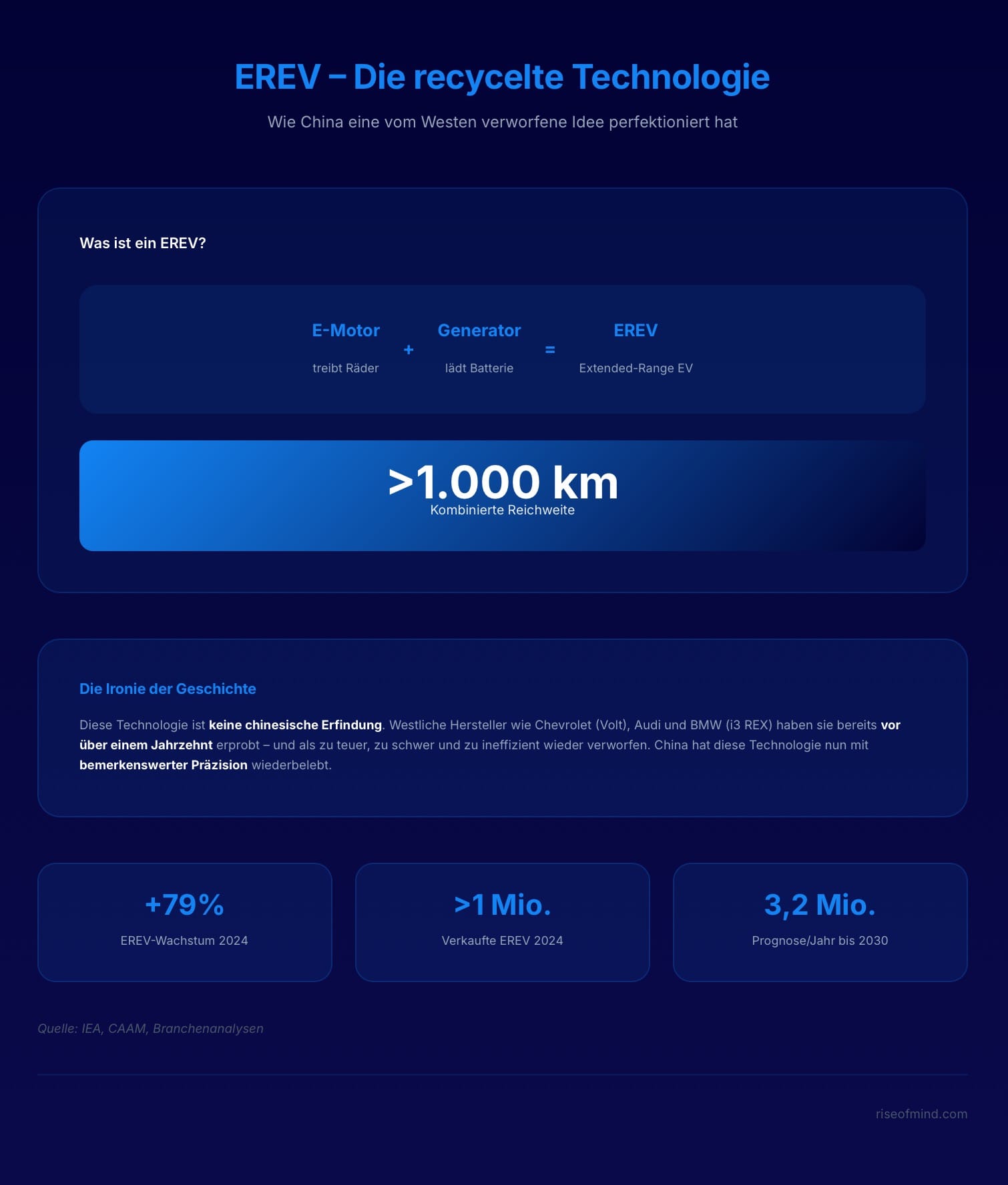 China hat diese Technologie nun mit bemerkenswerter Präzision wiederbelebt. Im Jahr 2024 stieg der Absatz von EREV-Fahrzeugen in China um 79 Prozent auf über eine Million Einheiten. Experten erwarten bis Ende des Jahrzehnts eine Jahresproduktion von etwa 3,2 Millionen Fahrzeugen.